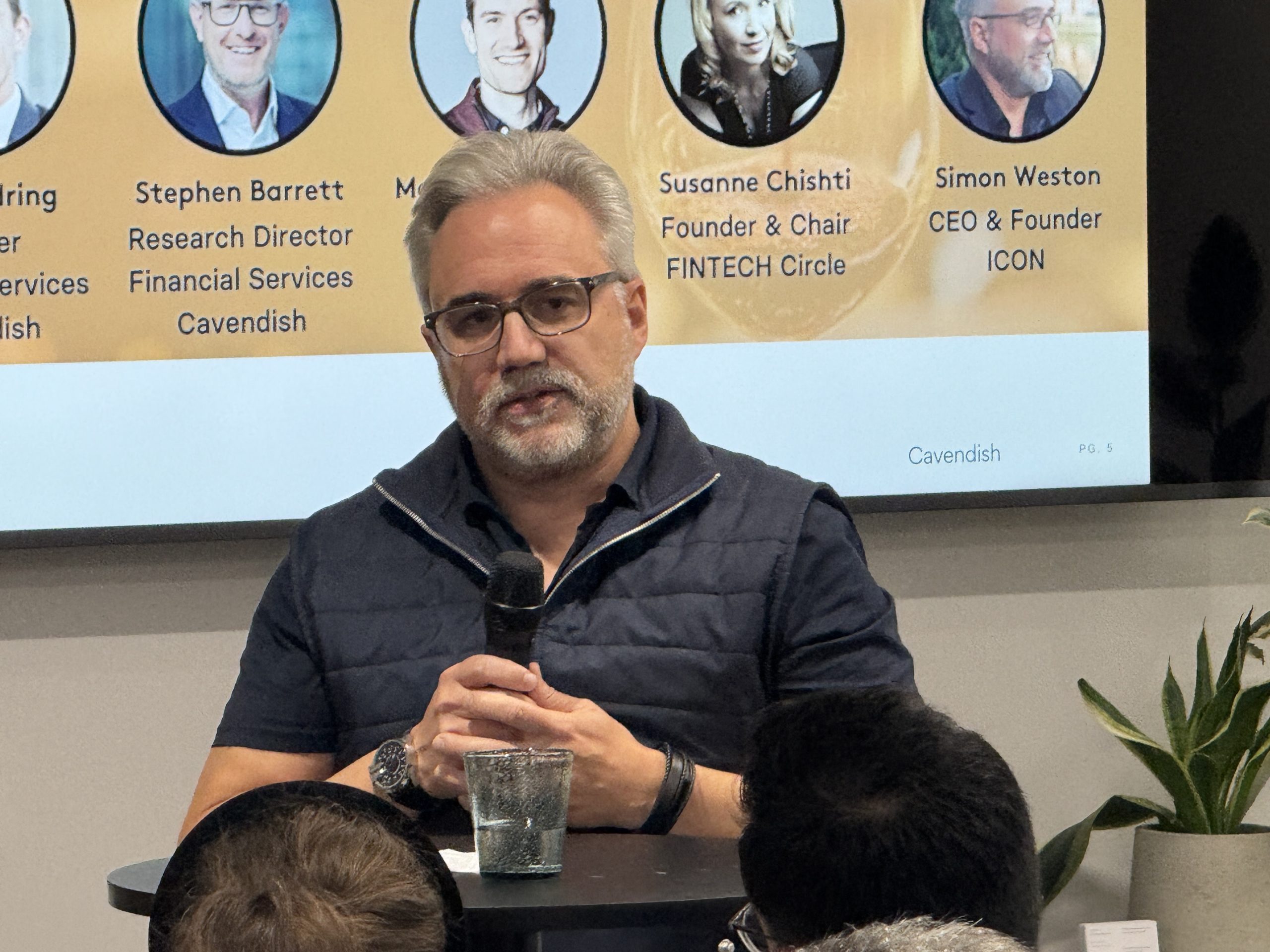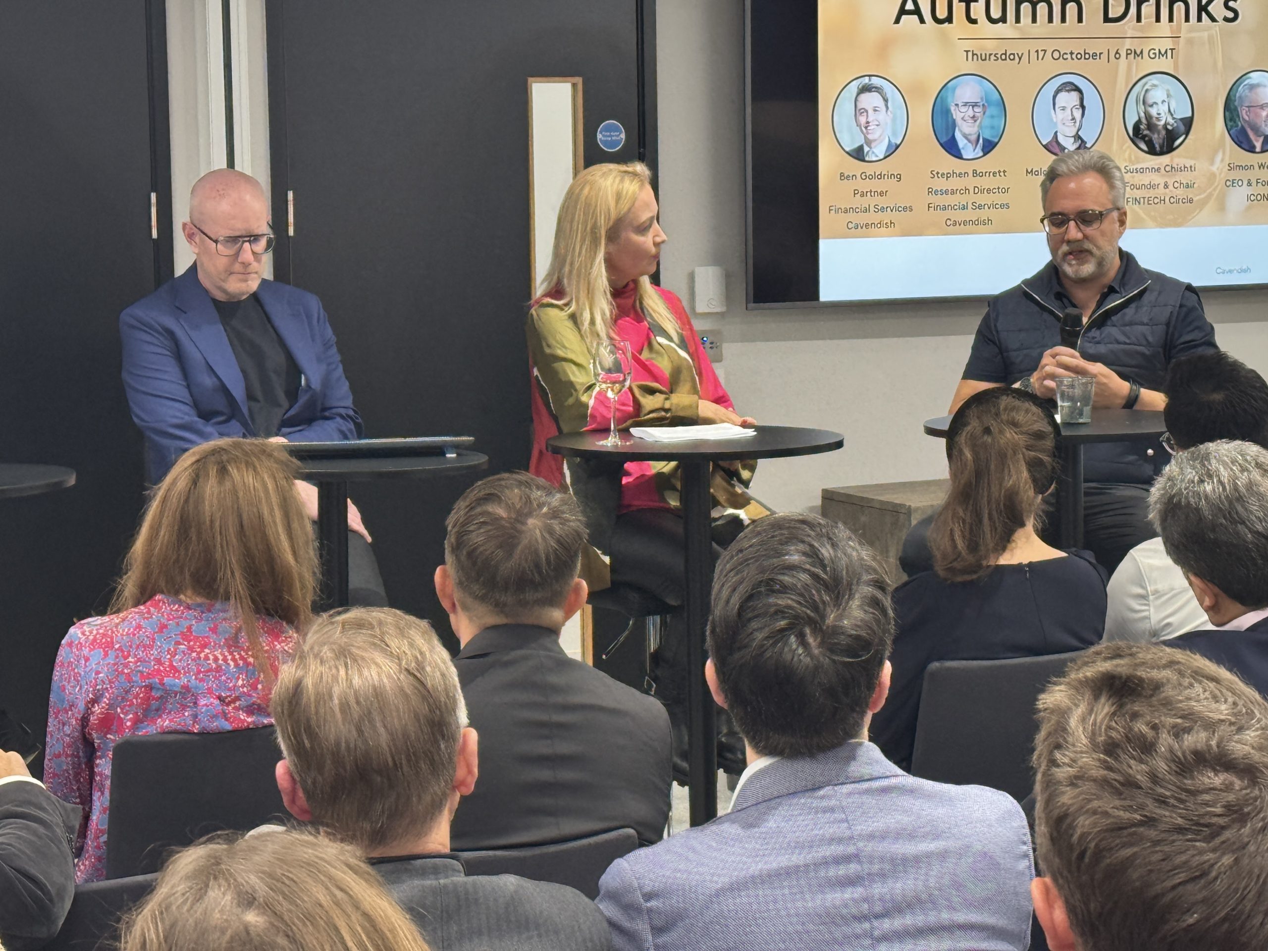 After welcome drinks, FINTECH Circle’s Chair Susanne Chishti opened the evening, followed by welcome words of Ben Goldring, Financial Services Partner at Cavendish. A keynote followed by Stephen Barrett, Head of Diversified Financials and Professional Services Research at Cavendish. Then the panel started consisting of: