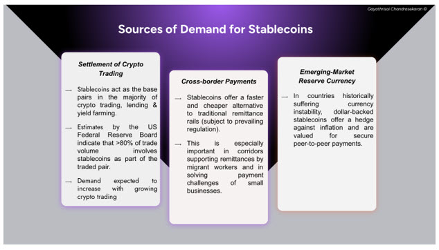 Popularity of Stablecoins stems from their speed, availability (24×7), inclusion (larger sections of the population underserved or excluded by KYC regulations have access), transparency and lower cost.