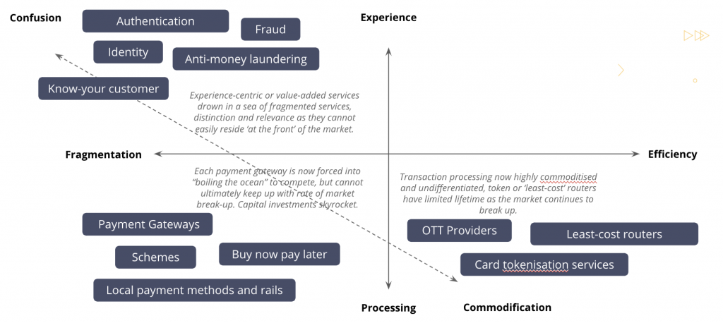The unintended consequence of all this B2C fintech mayhem (another morning, another pay-with-something) is that merchants face two problems. First, they can no longer easily differentiate across a commoditised processing market (Stripe is now one of many). Secondly, they must identify a way to consume and support/manage localised and specialised services (consider the cohort of Afterpay competitors entering the market, let alone faster/realtime banking and transactional platforms). Administration, technical and data costs skyrocket, and agility slows.